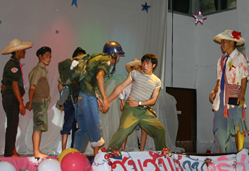 寮生たちの前に並んでプレゼントを掲げ、私やデッスリチャイ、アド、ブチュ、カンポン、ミボヤイたちが「なーんちゃって!」と笑顔で事実を打ち明けたところで、やっとホールに安堵感が漂い、拍手が起こった。が、中にはまだきょとんとしている子もいる。寮生たちの何割かはすでにこの計画を知っていたり、途中で気づいていたが、私も演技に加わって凶器(?)を持ち出すことまでは想定外だったらしくて、かなり緊張していたらしい。
